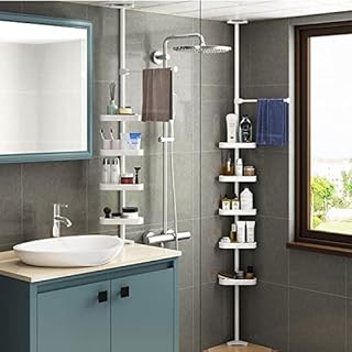 BUBM 浴室 突っ張り ラック 5段 コーナーラック お風呂 つっぱり棒 浴室収納 ラック 高さ135-250cm調整可能 風呂 つっぱり棒 伸縮棒 三角 バスラック ホワイト
