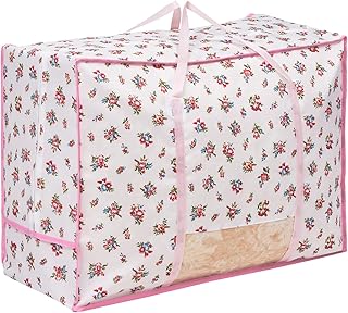 アストロ 羽毛布団収納袋 シングル・ダブル兼用 ホワイト×ピンク 花柄 洗える 清潔 大容量 透明窓 持ち手付き 820-06